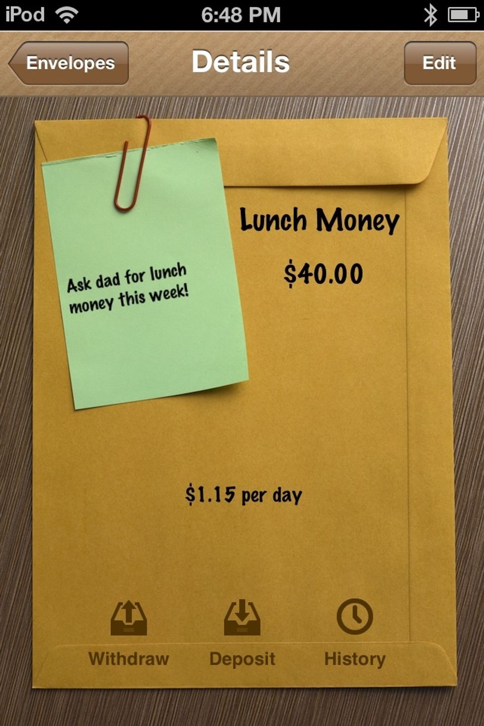 Right now the envelope is empty. Tap DEPOSIT to add some money into the envelope. You will use this a lot.