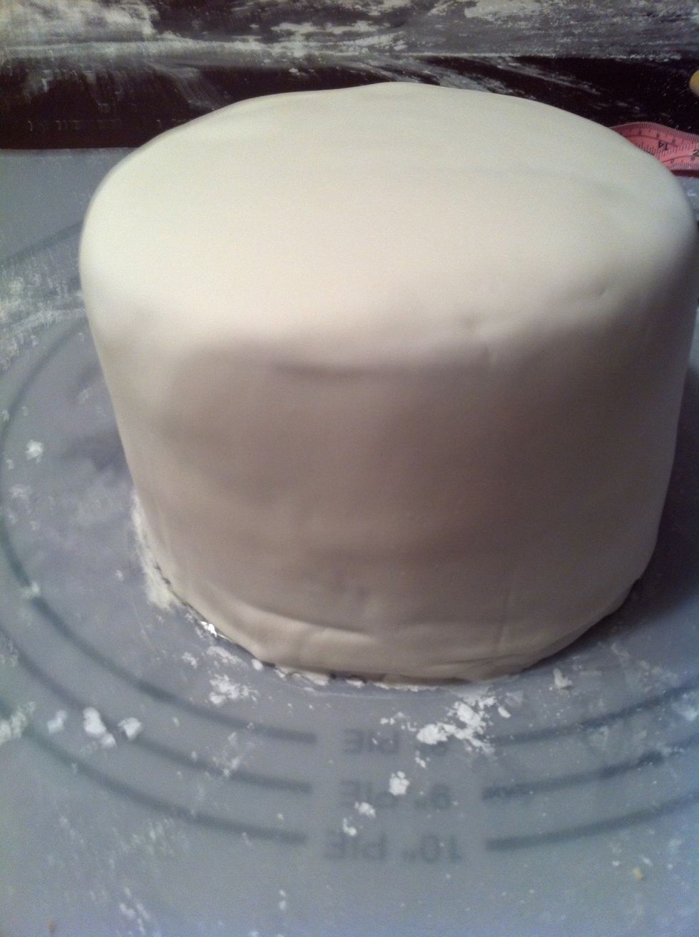 I used my hands to smooth the fondant (slowly) from top to bottom. Use a pizza cutter to cut off excess fondant & store the extra pieces in an air tight bag.
