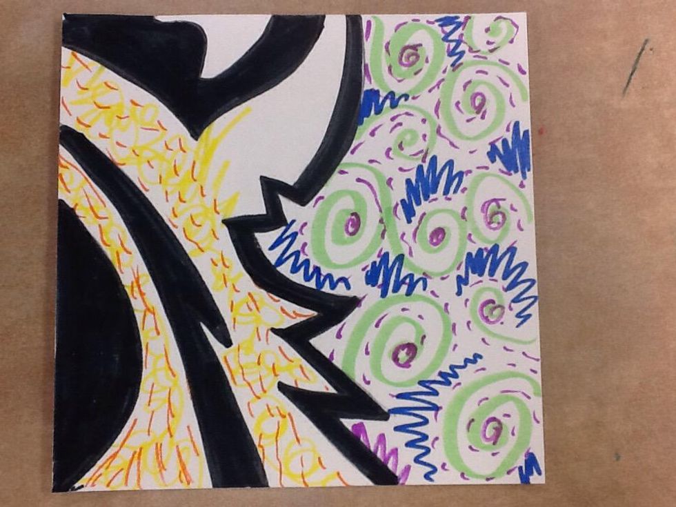In the areas on your small puzzle piece where you see light gray create line and shape designs using only yellow and orange marker.