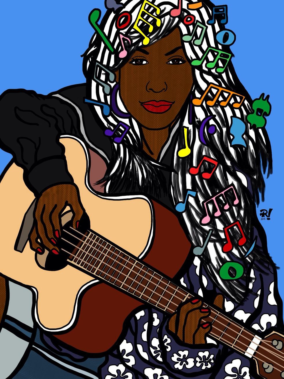 Next I create a new layer and drag it on top of the first. I call this the graphite layer. I work up the details of the figure and the guitar. The sketch is still loose but detailed.