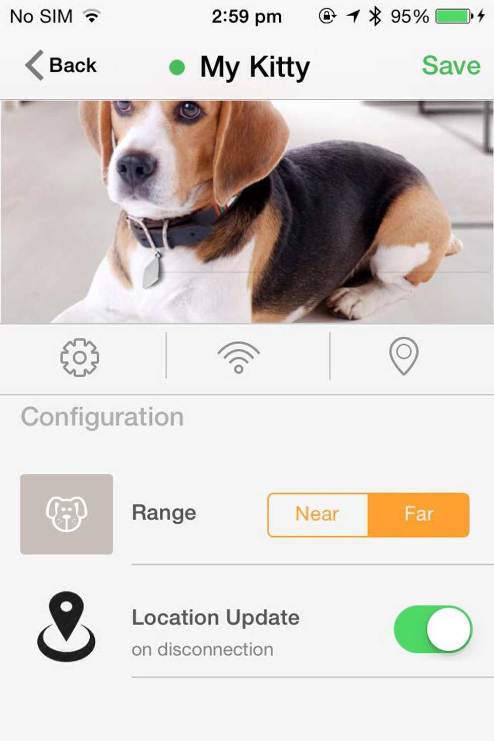 When your Gecko is in Pet mode , the profile screen looks as follows. Setting the 'Range' controls when the App will alert you about your pet going away.