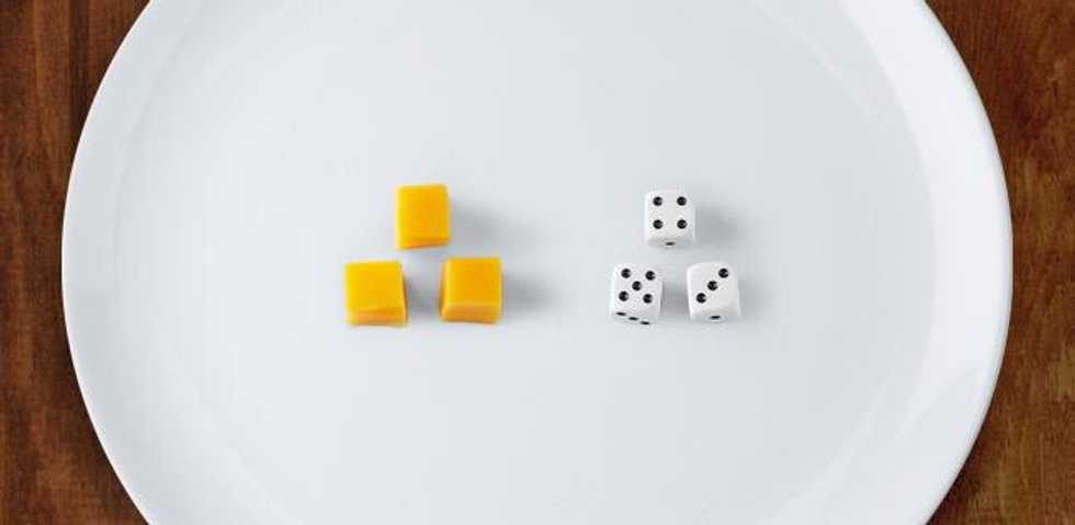 For dairy, the correct size of cheese is three cubes the size of dice for children and six cubes for adults.