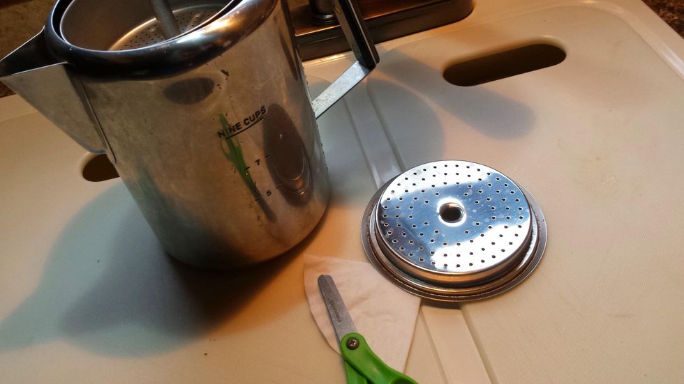 Set top basin back in. Take a coffee filter fold in quarters. Cut 1/4 inch off outside edge and clip the center out.
