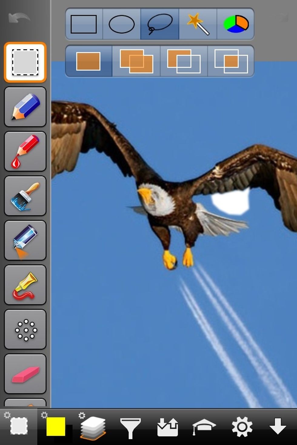 Next we have the tracing tool. Basically what this means is you select an area by drawing the shape you want to select. Think of it as cutting an area with an exacto knife. Draw by dragging or tapping