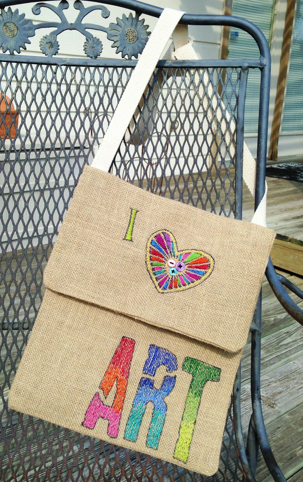 "art" was embroidered using 3 colors for each letter and gradually blending them together. random length vertical long stitches were taken in the natural holes in the weave of burlap.