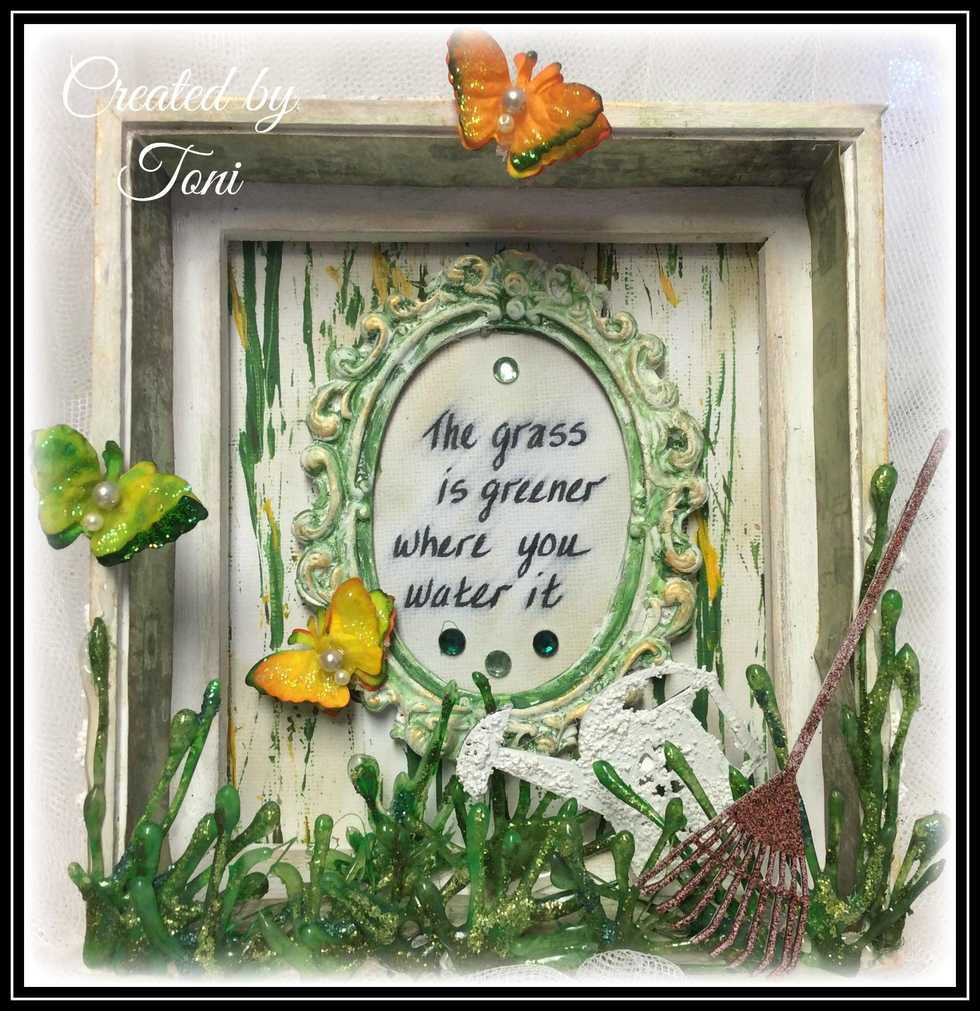 Now doesn't that grass look great... Never would have thought it to be glue... The chipboard pieces are Blue Fern. Copper embossing powder used on rake and stucco paste used on watering can.