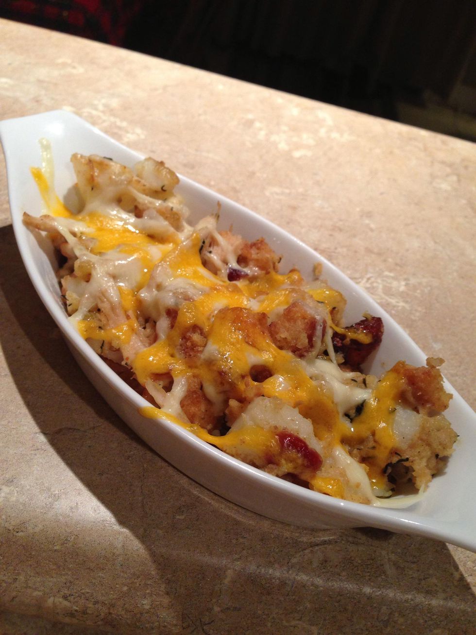 Place in any dish you would like to serve in and add some cheddar and Mozzarella cheese on top!