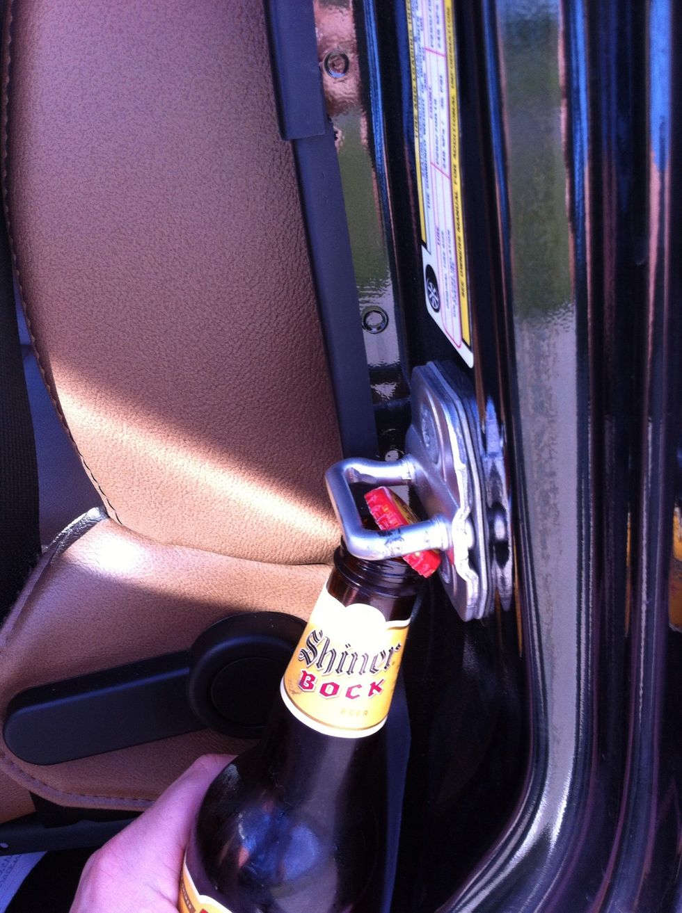 First pick your beer and open your Jeeps door. Then find the Nader bolt that your door latches onto. Place the bottle underneath it like so...