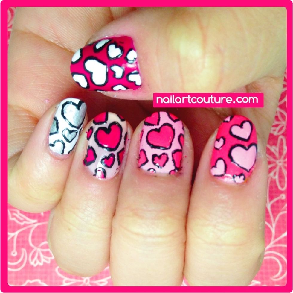 Using a black polish, outline the hearts.