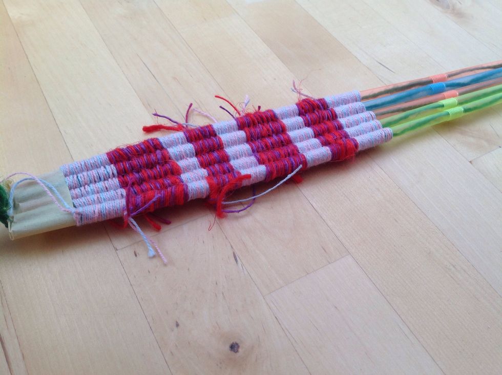 Nu är det bara att väva på tills det är lagom långt. När du byter färg knyter du bara på nästa tråd på den du håller på att väva med.