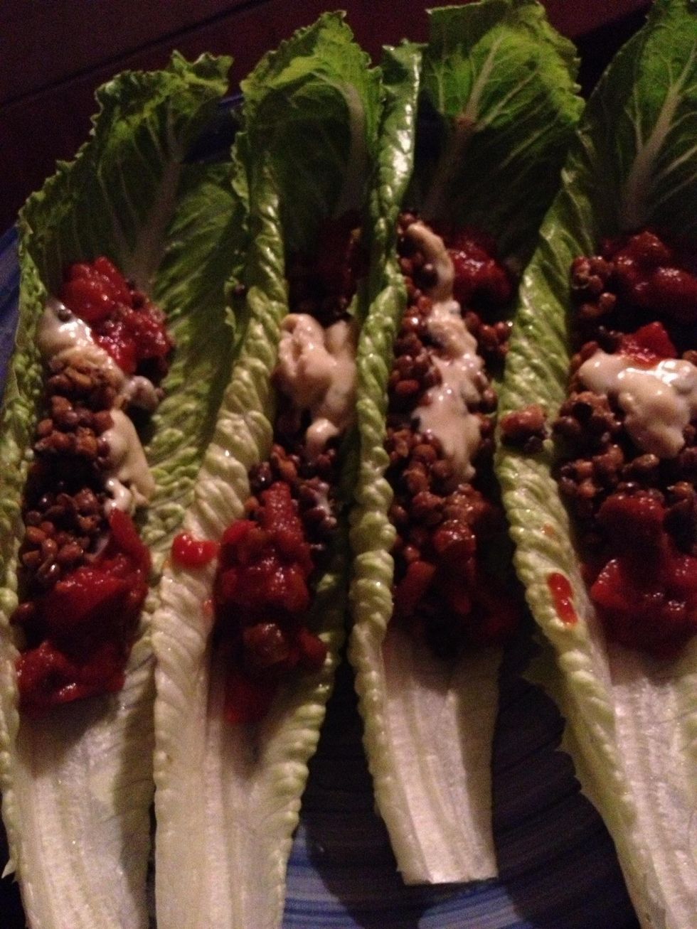 Clean romaine lettuce set aside. Add lentils to romaine then salsa. I would have liked fresh salsa but I went with what was in pantry.