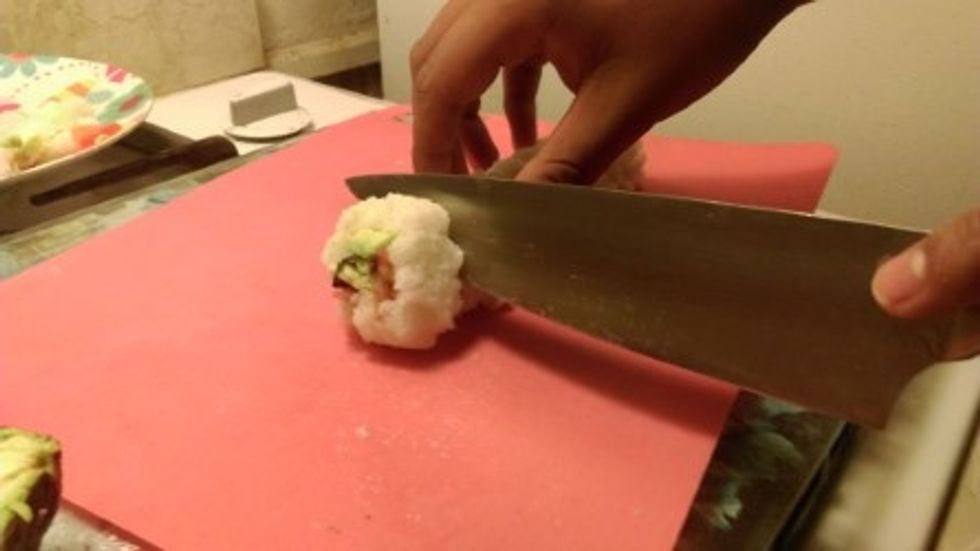 roll the sushi, and tuck in the filling. fold again to secure it.