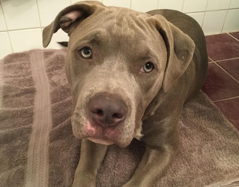 Pull dog out of bath and begin to dry.