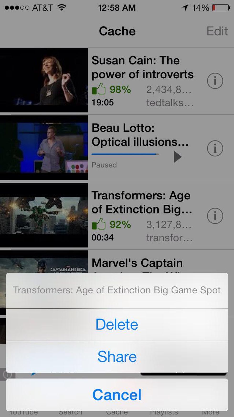 This is where your cached videos are accessible to watch offline. To play a video, select it. To delete a video (or share it via social media) choose the "i" to the right of the video.