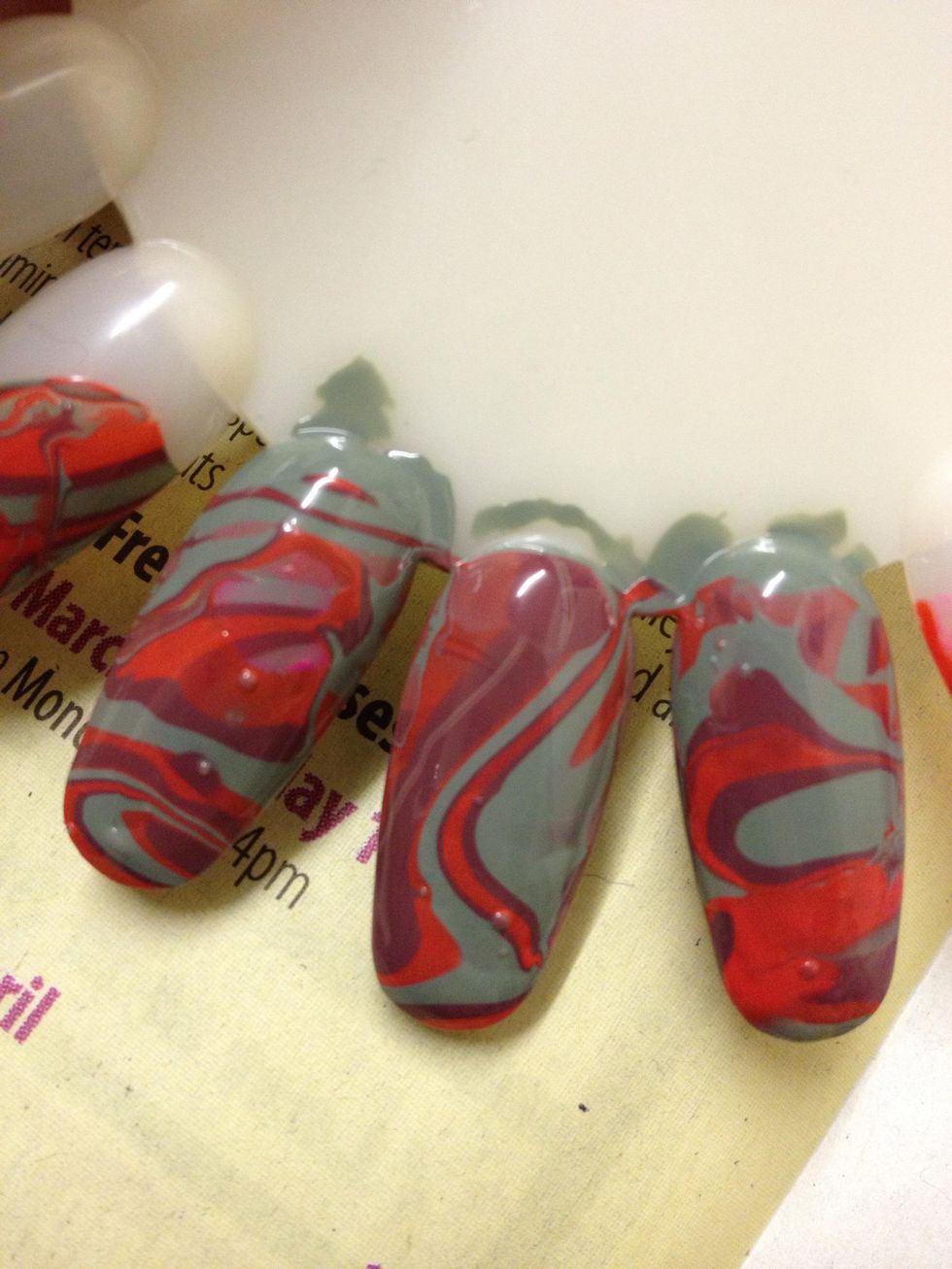 Drop your colours into the water in a bullseye effect and then using your toothpick etc, pull the colours around until it looks good.