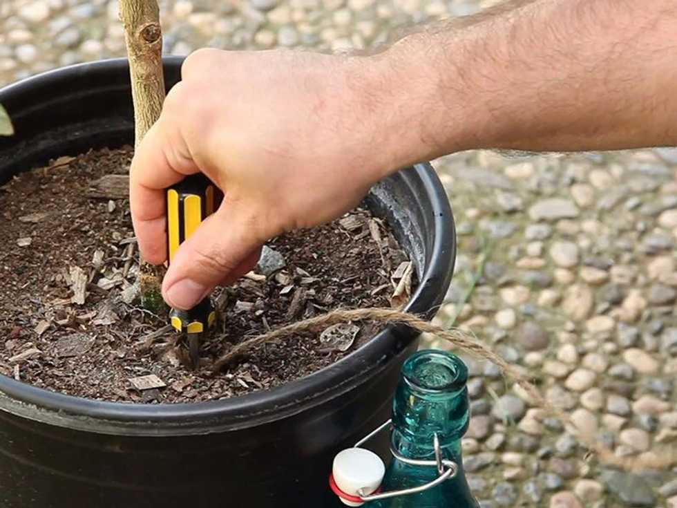 Place one end of the string deep in the plant soil.