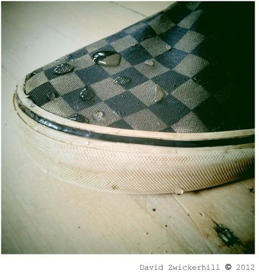 rub beeswax on the chosen shoes ( gloves optional )try to get as much as you can all over the materialmelt it with the hair dryerafter all is dry test the area for any holes to redo