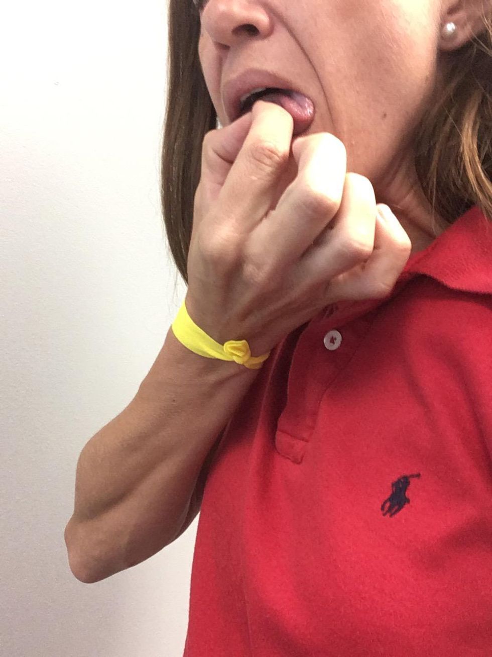 Make semi-circle with your thumb and index fingerFold over your tonguePlace semi-circle on your tongue and push down slightly