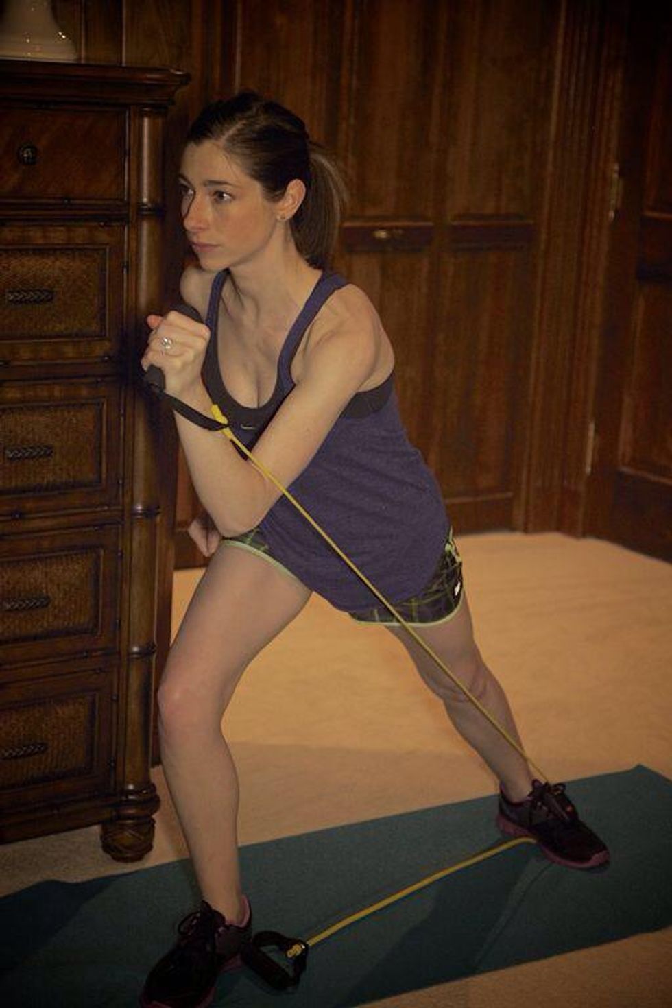 Side Lunge Pulls Step 1: place half the resistance band under your left foot and half in left hand.
