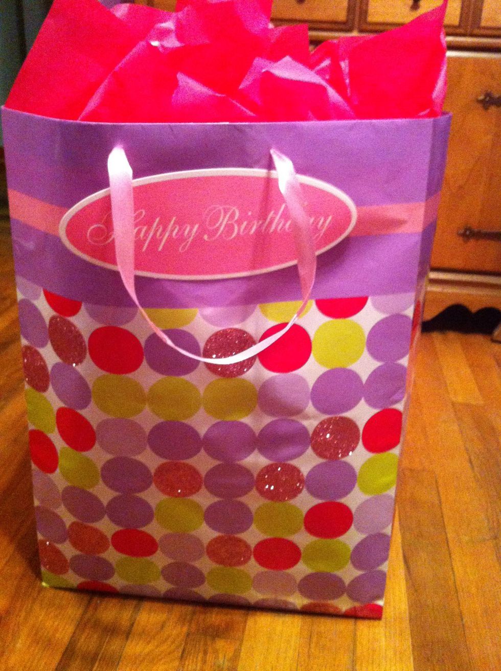 Now take the tissue paper and stuff it in the bag, and let it stick out some. Mine is a really hot pink.