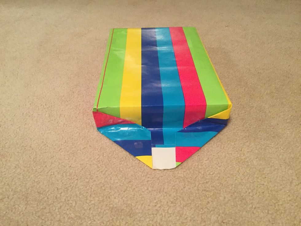 After cutting the present, pull one side of the paper to the middle of the present and tape in 2-3 different places.