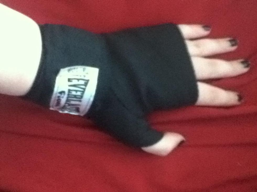 Wrap the wrap 2-3 time around your wristWrap around your thumb to protect the joint and again around your wristWrap around your knuckles 2-3 timesMake an X shape around your hand as soAnd finish by wrapping up the wrist again.