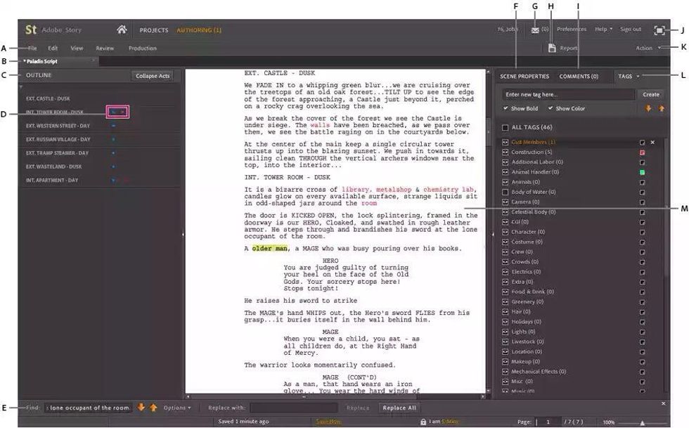 You have now arrived at the script! Adobe Story automatically formats everything in proper script form - all you need to do is use the right keyboard shortcuts!