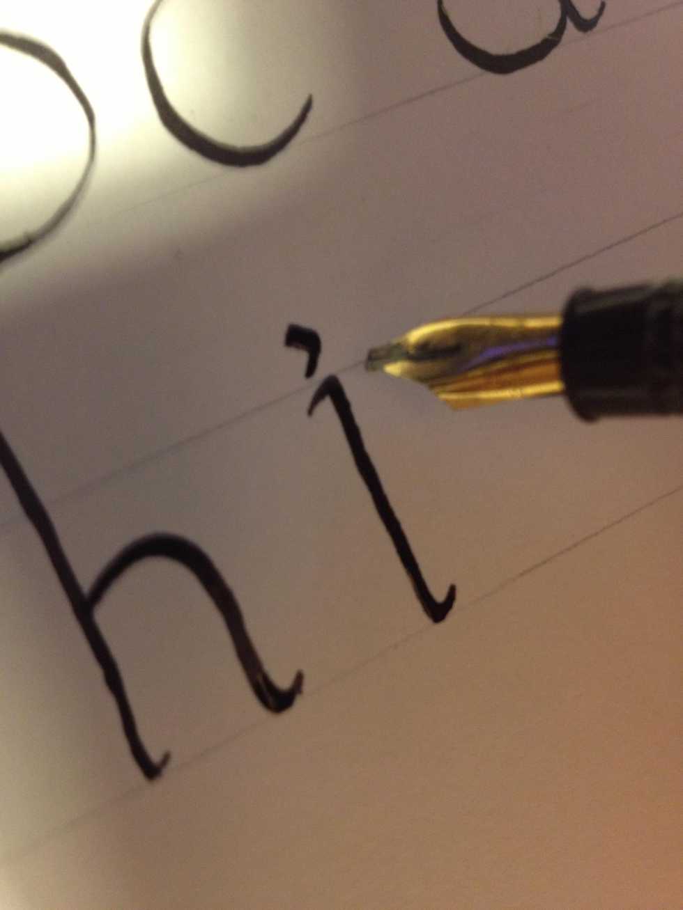 Dot the "i" by drawing a tiny half-circle clockwise. If you keep the same nib angle, it should look like a comma, as shown.