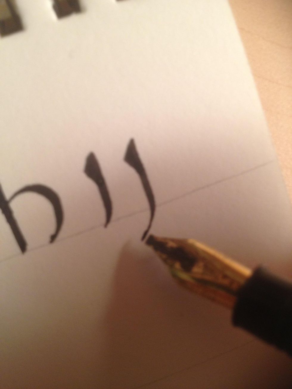 Make a circular stroke terminating at the bottom line; if your nib is angled correctly, the stroke should be thin at both ends and thick in the middle.