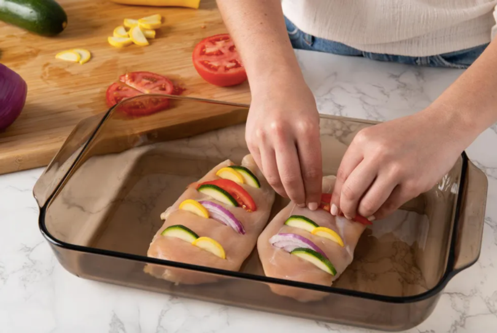Slice veggies into half moon shapes to easily add to the chicken. Then make horizontal cuts across each PERDUE® PERFECT PORTIONS® BONELESS, SKINLESS CHICKEN BREAST and place in a small oven-safe dish.