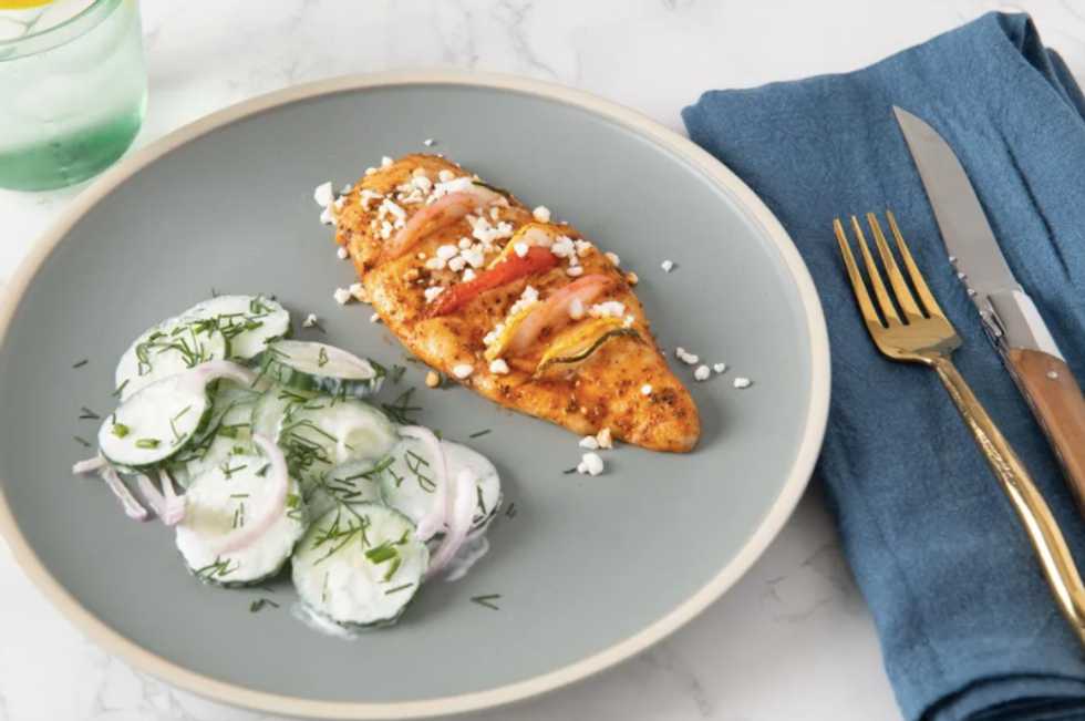 Remove the chicken from the oven, top with feta cheese, serve with a side of fries or a cucumber salad and enjoy!